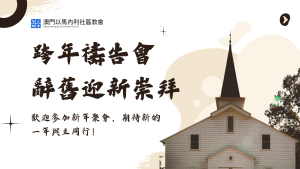 歡迎參加2026年新年聚會,期待新的一年與主同行! 時間:12月31日(週三)11:00 pm 回顧感恩 & 展望未來11:30 pm 跨年禱告會 & 辭舊迎新崇拜 地點:澳門基督教以馬內利教會